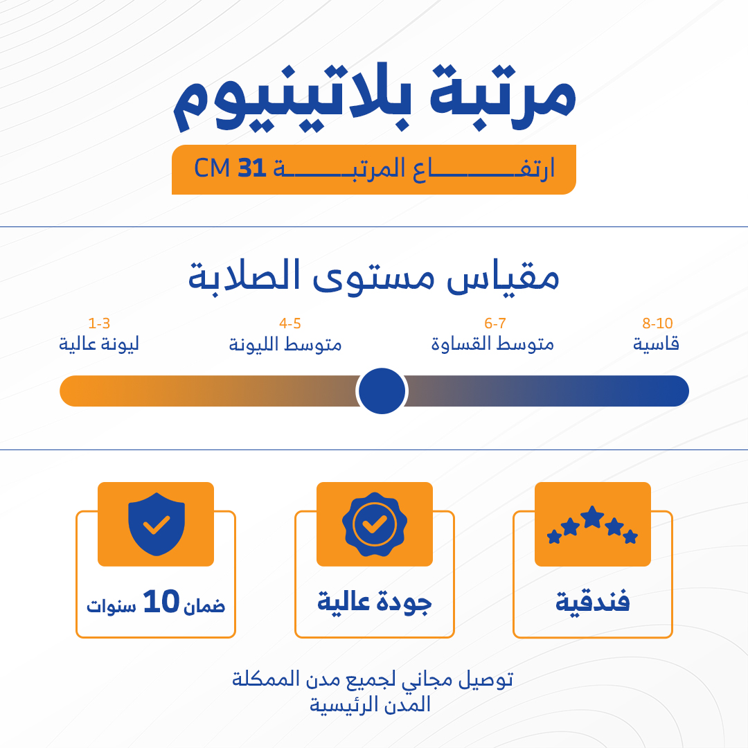لعشاق الفخامة مرتبة بلاتينيوم توفر لك تجربة نوم فندقية من فئة النجوم الخمس وهي العنوان الحقيقي للنوم المريح، تجمع بين افخم المواد الطبيعية وافضل التقنيات الحديثة التي توصلت اليها صناعة المراتب لتمنحك شعورا بالرفاهية والنعومة والانسجام تتكون من طبقات داخلية تدعم التهوية ومقاومة للرطوبة و تمتاز بنظام نوابض منفصلة تعزل حركة الجسم لتشعرك بإحساس الرفاهية والراحة الكاملة.