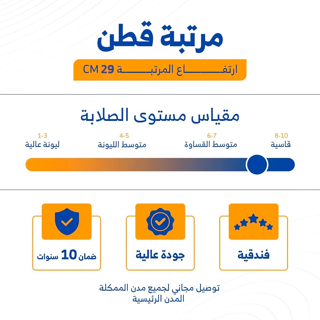 رفاهية النوم الصحي! مكونة من القطن الطبيعي 100% وتعتبر من المراتب ذات القساوة وتعطي الجسم الدعم اللازم للمحافظة على العمود الفقري، تحافظ على تنظيم درجة حرارة الجسم ودرجة حرارة المرتبة ويبقيها باردة في الصيف والشتاء، تمتاز بنظام الانحناء الذكي بفضل النوابض المنفصلة.
